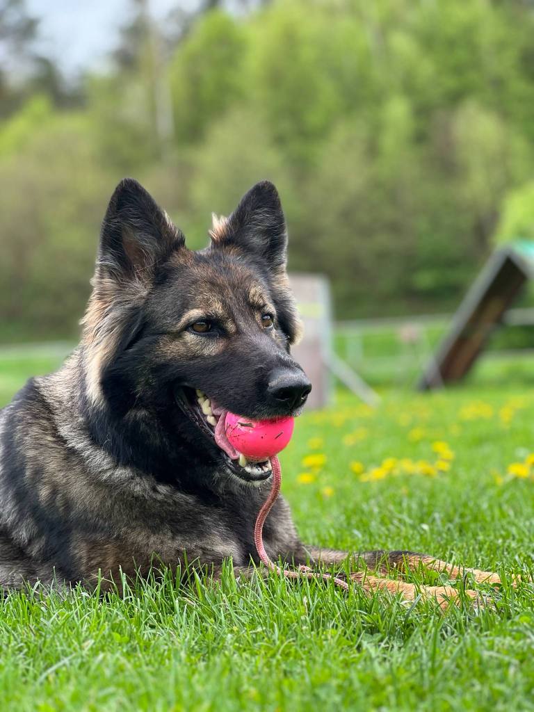 She is a spicy girl. She is a super female with an awesome nose. Loves to track. Always willing to please. Full calm grips. She is social with other dogs and people. She is medium/high drive. We own her full sister and she’s an amazing dog.