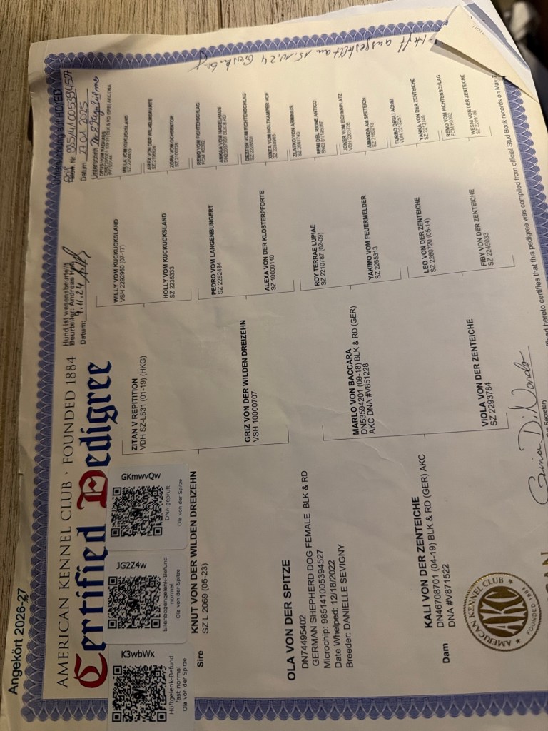 Ola vd Spitze V WB BH/VT IGP1 KKL SG21 BSZS (world show) Health Clearances: Fast Normal/Normal DM Clear Pedigree Embark Results. Health Testing: Share this: Share on X (Opens in new window) X Share on Facebook (Opens in new window) Facebook Like Loading...